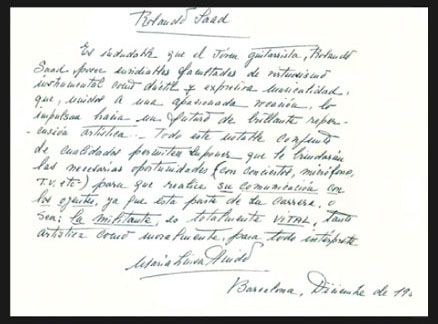 La maestra y guitarrista había sido alumna de Miguel Llobet, de Josena Robledo, de Domingo Prat: es decir, que se había formado con los mejores alumnos de Francisco Tárrega y contaba en su trayectoria exitosas giras por todo el mundo. Rolando Saad estaba a punto de cumplir su sueño y ser depositario de los conocimientos de todos los que, como él, habían amado a la guitarra española y había hecho de ese amor un arte.